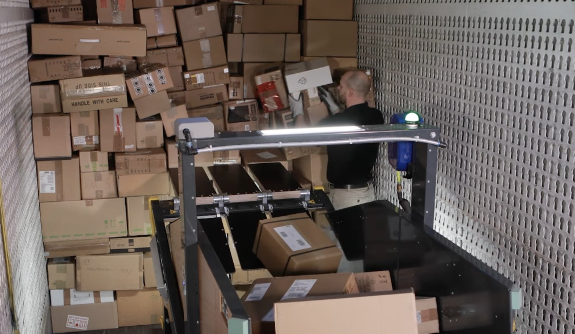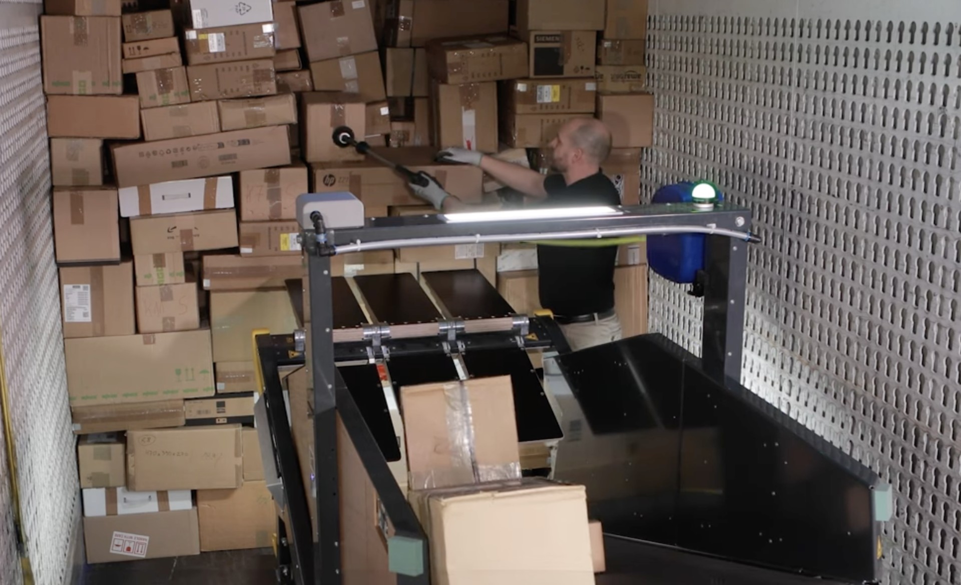 The system enables throughput of up to 3,000 parcels per hour with just one operator, representing a significant efficiency improvement over traditional manual unloading methods that typically achieve much lower rates.