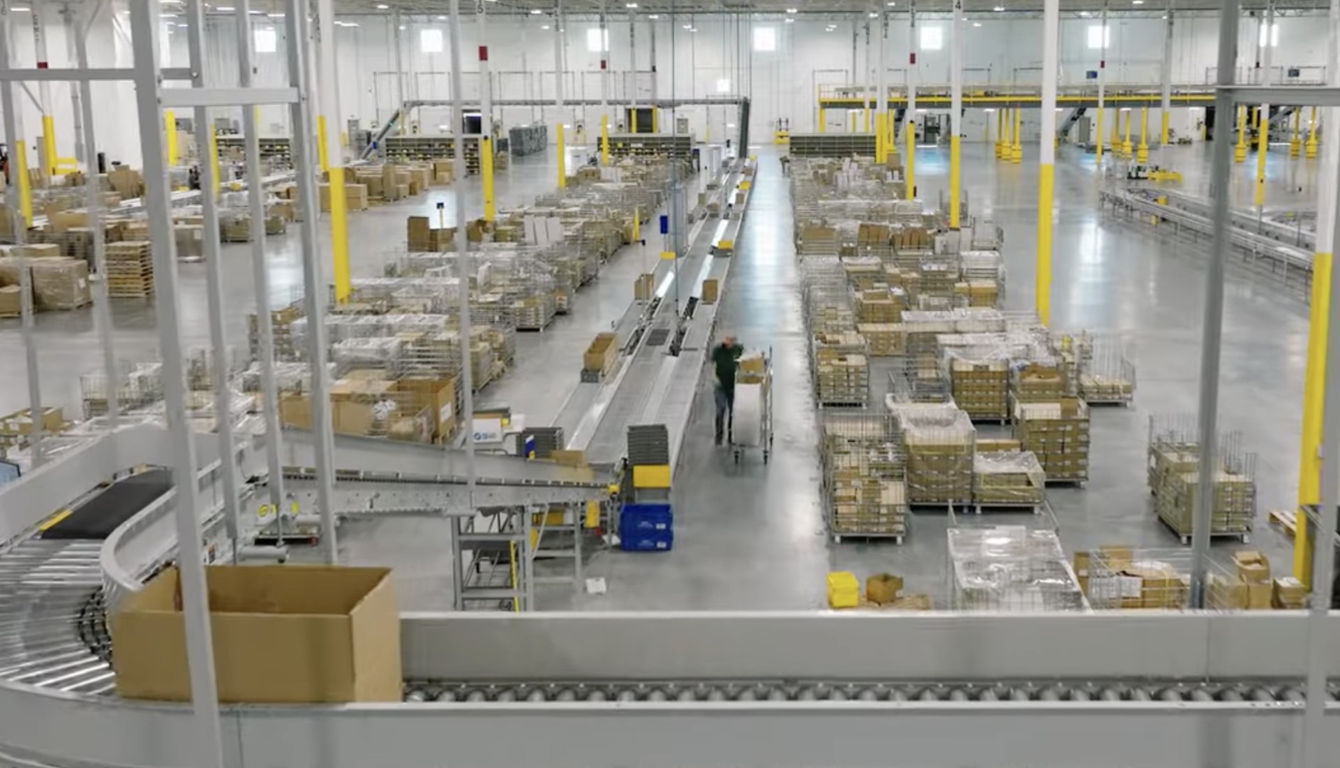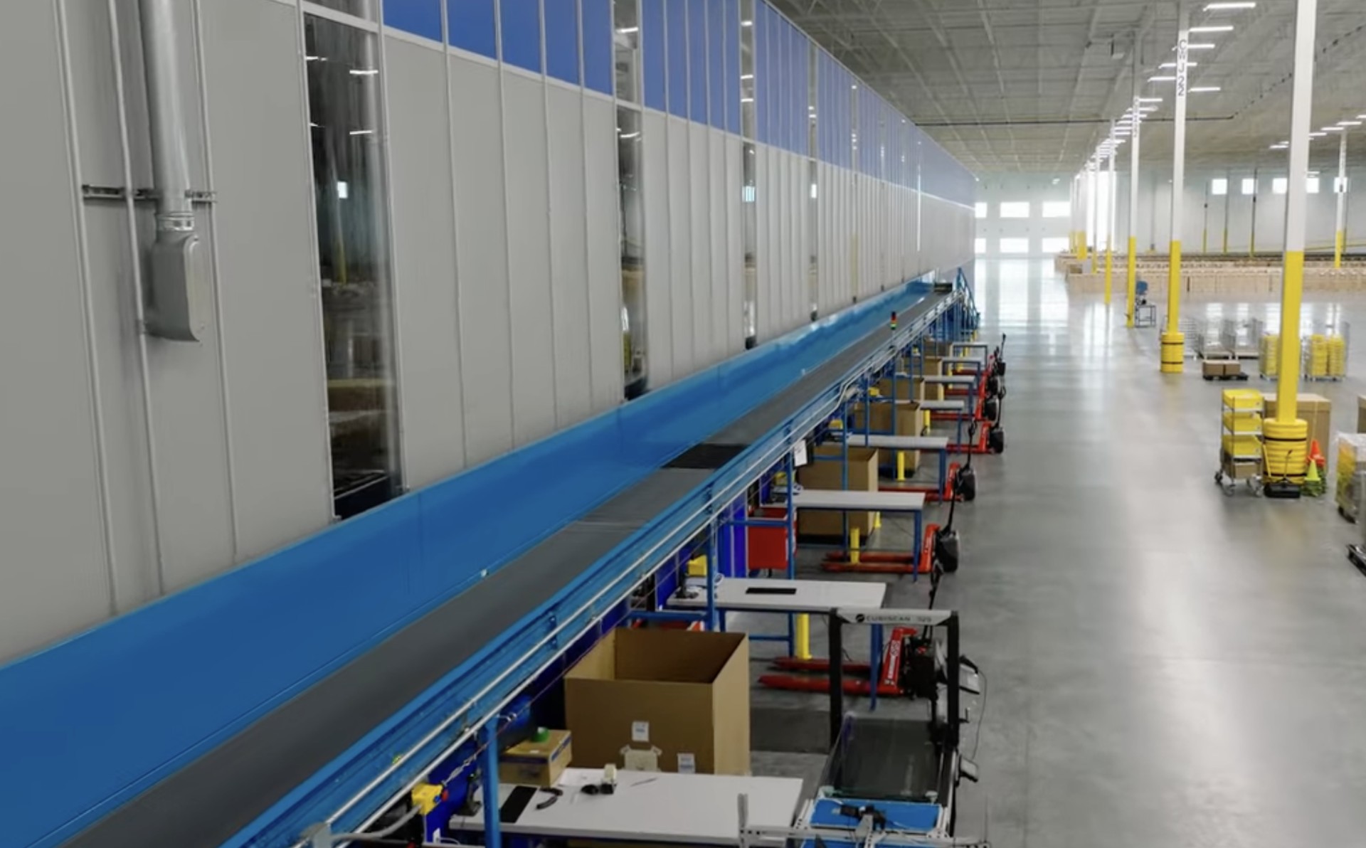 The dual-mode operation efficiently handles both external customer fulfillment and internal manufacturing support, with seamless transitions between order types. The conveyor and sortation system enables automated routing and consolidation of orders throughout the 1 million square foot facility.