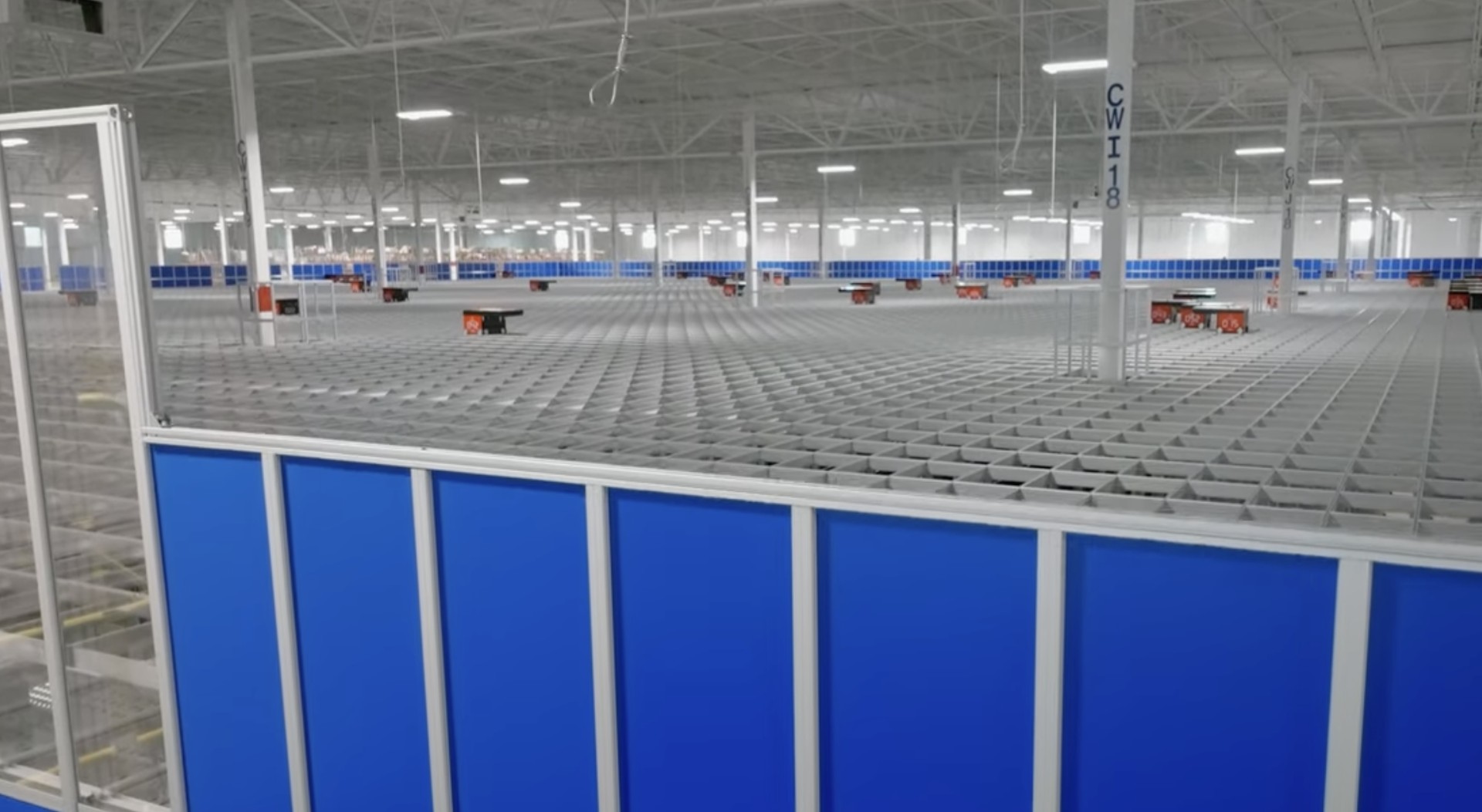 The facility features an AutoStore cubic storage system housing approximately 53,000 of the total 65,000 SKUs. The system provides high-density storage and efficient goods-to-person retrieval operations. Robots deliver bins to picking stations where operators fulfill orders using visual guidance systems.