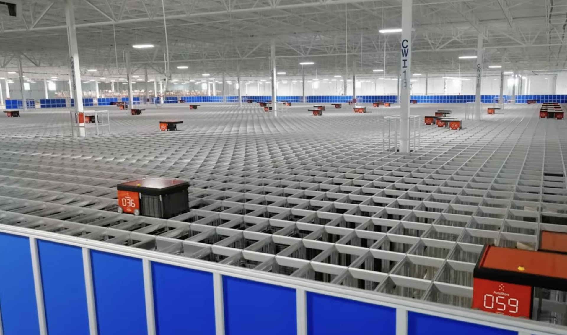 βœ“High-speed autonomous robots operating on a grid above storage bins
