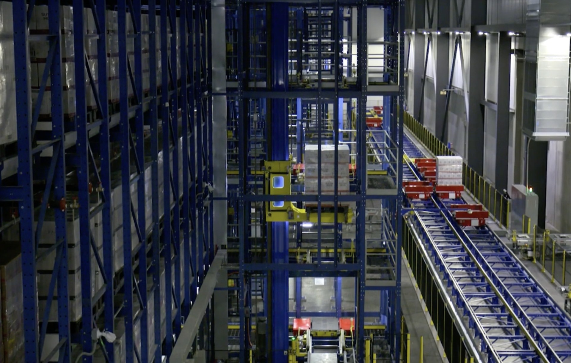 The facility features Swisslog's PowerStore automated storage and retrieval system with a massive capacity of 4 million cases (over 60,000 pallets). The system stands nine levels high, equivalent to a seven-story building, providing exceptional storage density in a compact footprint.