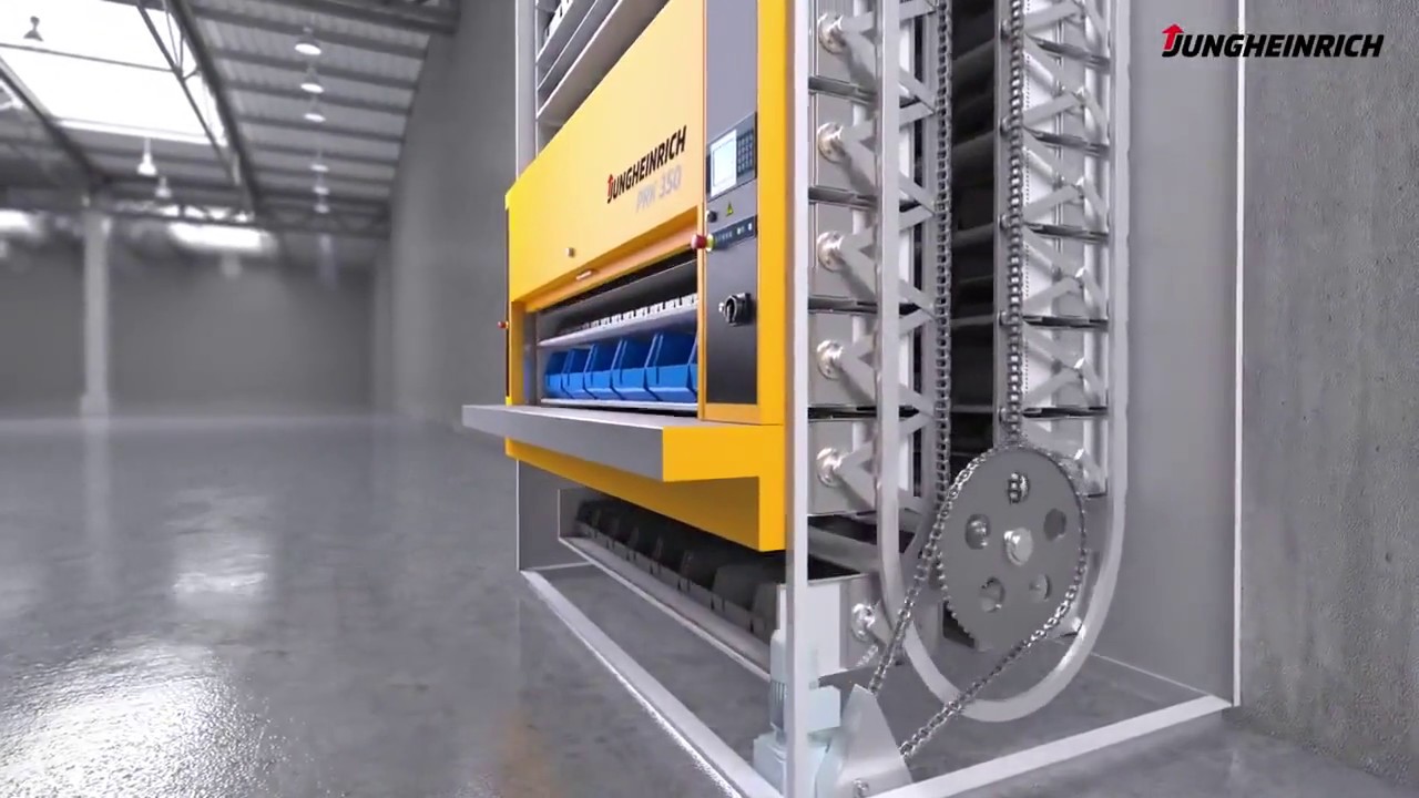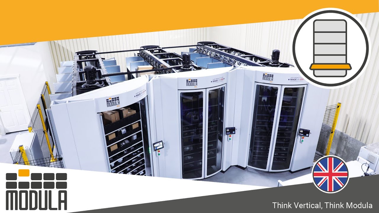 The system operates as an automated vertical carousel. Document carriers are arranged in vertical columns that rotate automatically. When a file is requested, the system rotates to bring the specific carrier containing that file to a fixed, ergonomically positioned retrieval drawer or access point.