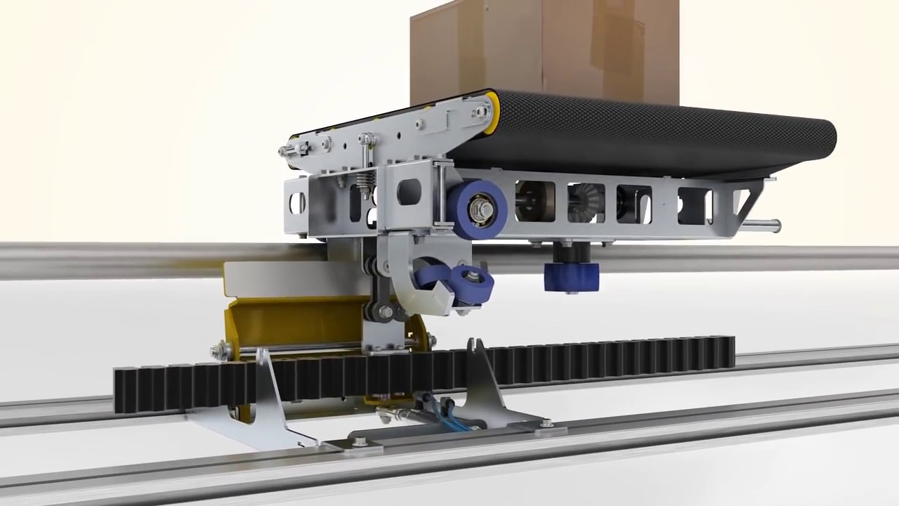 The system operates on a patented friction drive principle. A centrally powered rotating tube runs along the track. Each trolley is equipped with angled wheels that contact this tube. The rotation of the tube is transmitted through these wheels, creating friction that propels the trolley forward, eliminating the need for a traditional chain.